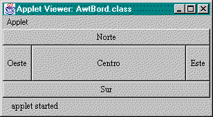 La composición BorderLayout (de borde) proporciona un esquema más complejo de colocación de los Componentes en un panel. La composición utiliza cinco zonas para colocar los Componentes sobre ellas: Norte, Sur, Este, Oeste y Centro. Es el layout o composición que se utilizan por defecto Frame y Dialog.
